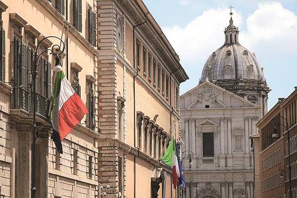 当地时间2023年6月12日,意大利罗马,意大利参议院公共办公室外的意大利和欧洲的国旗降半旗,以纪念前总理西尔维奥·贝卢斯科尼的去世。 据澎湃新闻