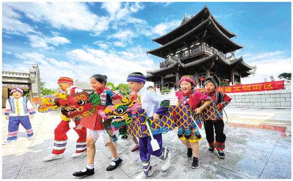 6月19日,秀峰区秀峰街道解东社区开展迎端午活动,让居民群众在家门口体验传统文化的魅力和端午节的乐趣。图为中华小学的学生们正在进行旱地龙舟赛。记者滕嘉 摄