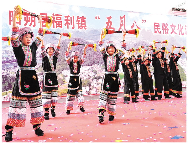 25日,阳朔县福利镇“五月八”民俗文化活动开幕式上,小朋友们表演当地传统舞蹈《瑶族长鼓舞》。福利“五月八”是阳朔县福利镇一项传统民间民俗文化活动,于2016年成功申报为自治区非物质文化遗产,是福利镇传承弘扬孝义文化的主要方式之一。近年来,当地深挖渔鼓、板凳龙、牌灯、长鼓舞等民俗文化资源,并将其引入校园,让民俗文化不断传承创新。记者李凯 摄