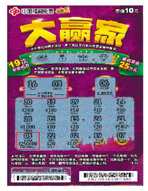 7月5日,因工作原因她在恭城滨江苑开发区等朋友,刚好旁边有家投注站就进去买了6张“百发百中”,幸运地中了20元,但看着身旁的小伙买了一整本“大赢家”刮出了580元,心痒痒的她又重新购买了两张“大赢家”,谁知在刮开第二张时,“我的号码”与“中奖号码”都有“03”,于是她赶紧刮开下方对应的奖金,“¥250,000”的图符浮现在眼前。“经过反复确认,我才相信自己真的中了头奖25万元,成为货真价实的大赢家!”小莫乐呵呵地说道。