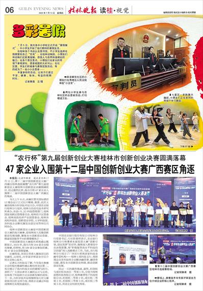 本报讯(记者阳聃甫 通讯员万玮)7月11日,第十二届中国创新创业大赛广西赛区桂林选拔赛暨“农行杯”第九届创新创业大赛桂林市创新创业决赛圆满收官。经过激烈比拼,我市共有47家企业入围第十二届中国创新创业大赛广西赛区的角逐。