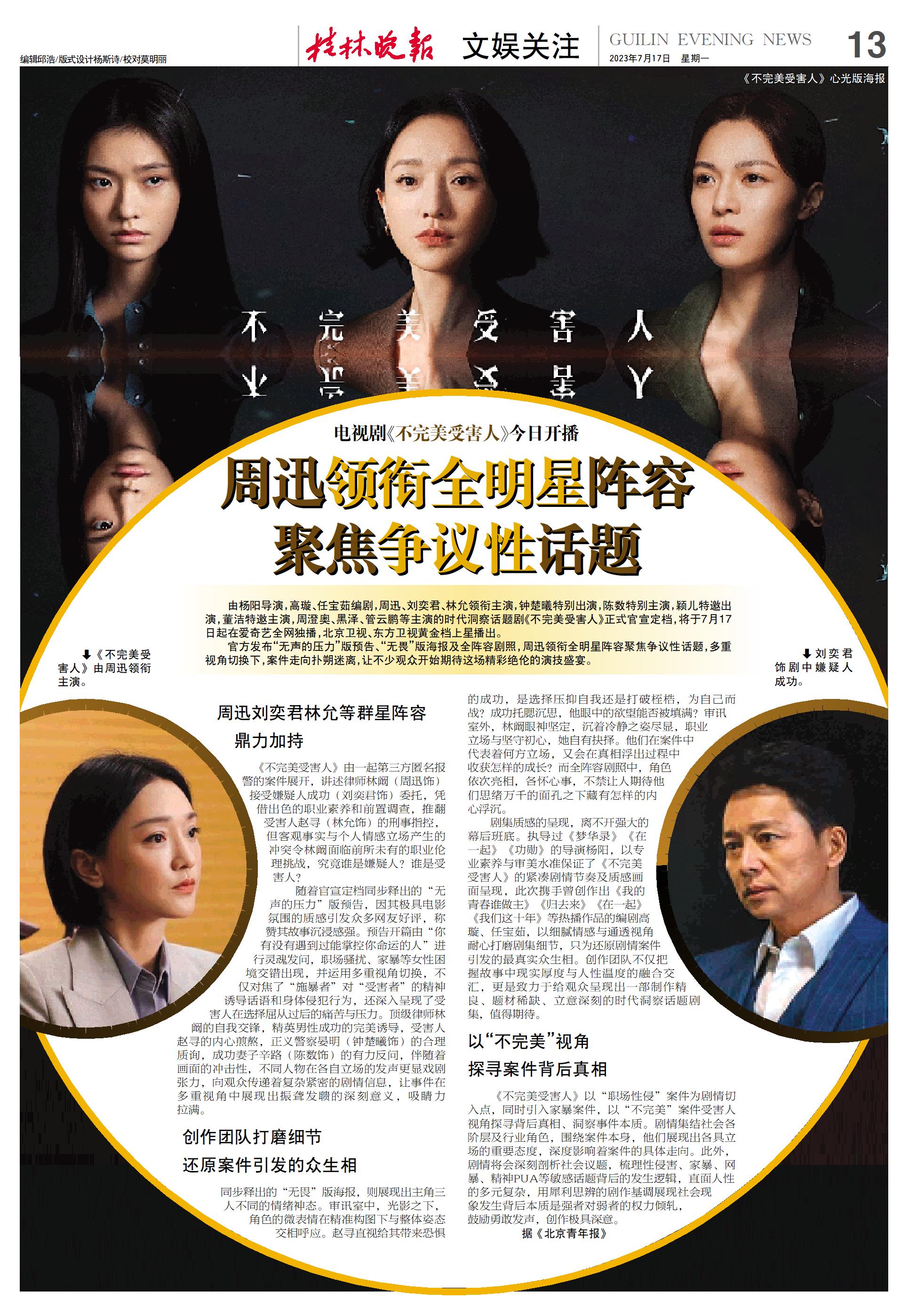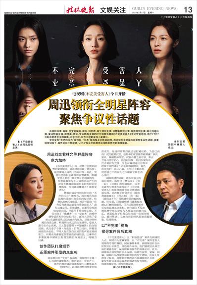 由杨阳导演,高璇、任宝茹编剧,周迅、刘奕君、林允领衔主演,钟楚曦特别出演,陈数特别主演,颖儿特邀出演,董洁特邀主演,周澄奥、黑泽、管云鹏等主演的时代洞察话题剧《不完美受害人》正式官宣定档,将于7月17日起在爱奇艺全网独播,北京卫视、东方卫视黄金档上星播出。