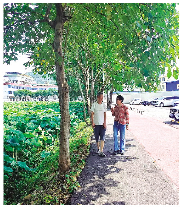 尹金华和黄业玉走在八角塘边,回忆过去“三山共映水面”的美景。