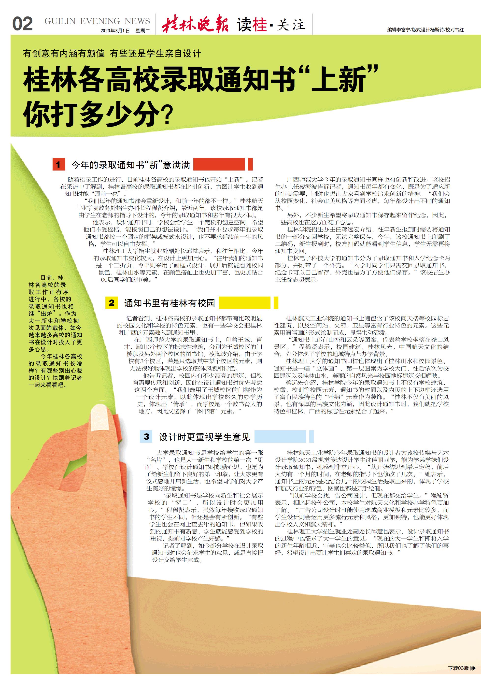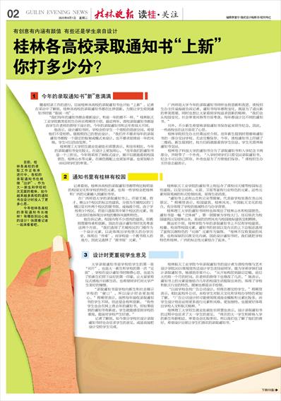 目前,桂林各高校的录取工作正有序进行中,各校的录取通知书也相继“出炉”。作为大一新生和学校初次见面的载体,如今越来越多高校的通知书在设计时投入了更多心思。