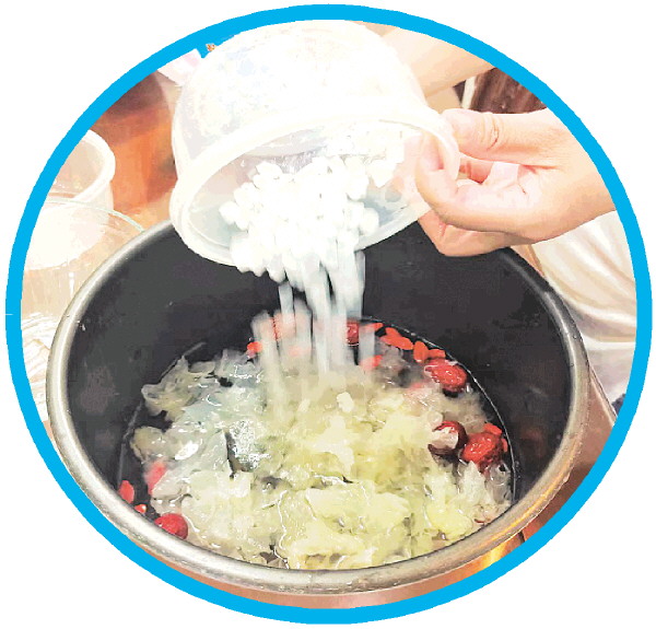 “冬天时,把桃胶炖一炖,等稍微冷却一点再喝,可以养胃。”秦梅英说,“夏天时,做法和吃法就更多了。”秦梅英说,桃胶最常搭配的是银耳,还可以跟薏米、桂圆等一起炖,然后冰镇,都是营养又美味的甜品。秦梅英选的桃胶都是野生的桃胶。她说,做桃胶时,至少要提前6小时泡发,从一小团发胀成一小盆。秦梅英泡发桃胶时会选用白瓷盆,方便看清楚桃胶里混杂的树皮等杂质。将杂质一点点挑拣出来,泡在水里的桃胶就成了小水母状。秦梅英说,银耳也要提前泡发,自己做银耳时,是要充分泡发后将底部黄色的“根”去掉。如果追求养生,秦梅英会选择加入红枣和枸杞,再加入适量冰糖,一起倒进高压锅里闷煮30分钟就可以了。