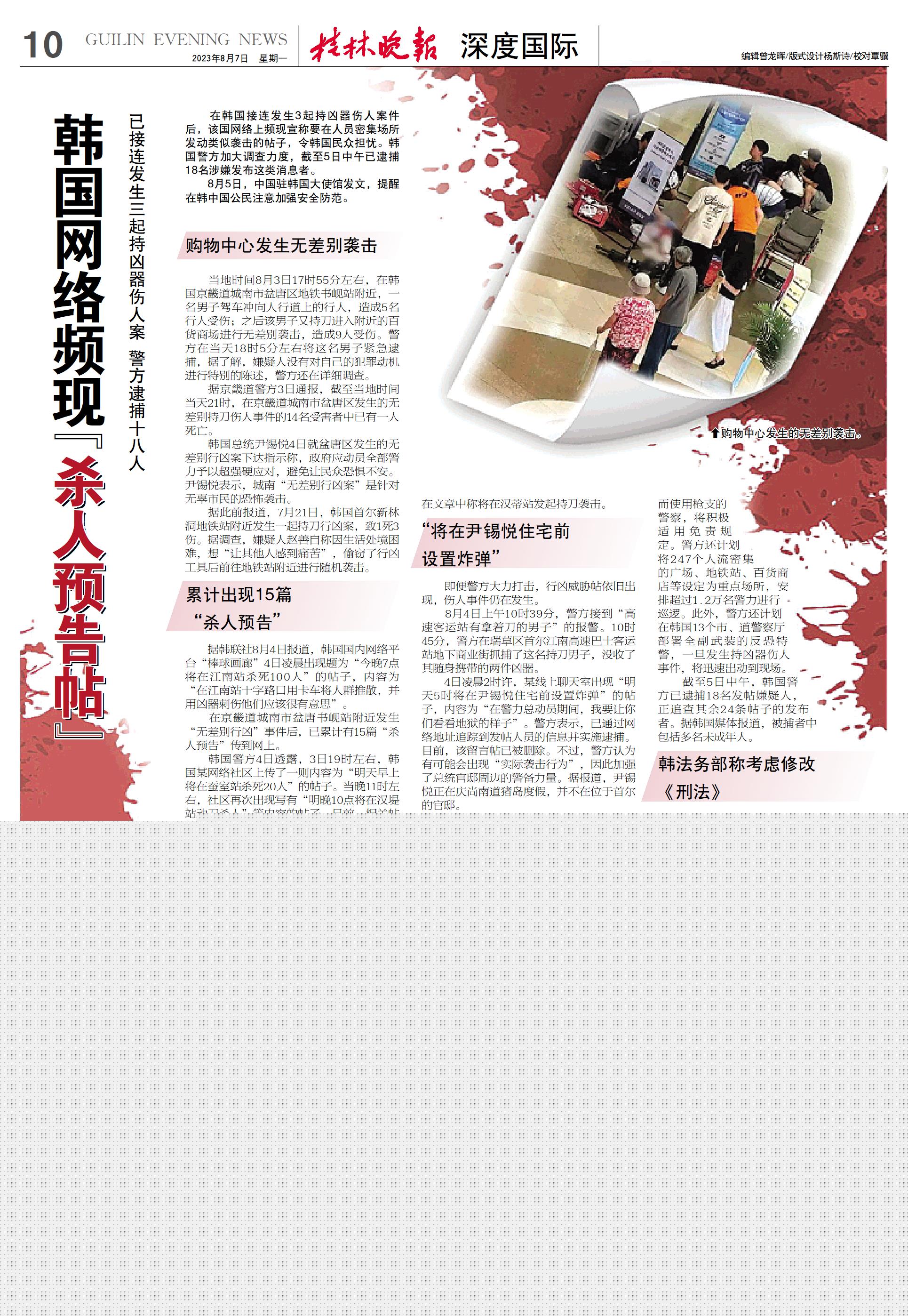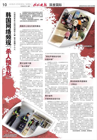 韩国《世界日报》4日报道称,接连发生在人群密集地区的随机行凶案,让韩国正面临重大治安威胁。虽然韩国政府和司法机构纷纷表态要强硬应对,但民众的不安心理正在加重,特别是网上各种“杀人预告”帖的泛滥,引发了大家对发生模仿犯罪案件越来越大的忧虑。韩国京畿大学犯罪心理学教授李水晶认为,这是政府相关部门对网络空间上频繁出现的、被视为“年轻人之间的口角”的犯罪行为“不以为然、自由放纵”的后果。