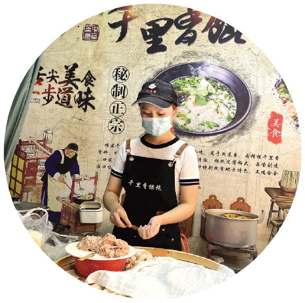 在收到顾客的点餐需求后,周宏佳招呼顾客就坐,洗完手就给顾客拿蒸好的小笼包,再将生的小笼包补充到蒸屉上。龙芳丽也停下了包馄饨的动作,熟练地将馄饨放进锅里煮,在碗里放入紫菜和香葱油,再浇上骨头熬制的高汤。稍作等待,再将煮好的馄饨捞到碗里,一碗千里香馄饨就做好了。周宏佳趁热将刚做好的馄饨端到顾客的餐桌上,让顾客能吃到馄饨的最佳口感。