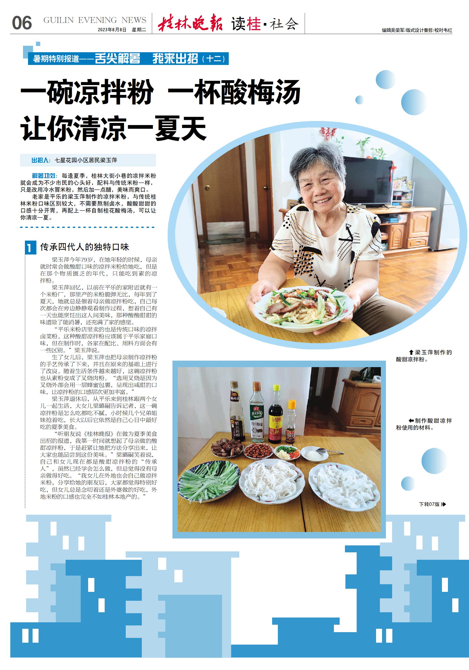 “听朋友说《桂林晚报》在做为夏季美食出招的报道,我第一时间就想起了母亲做的酸甜凉拌粉,于是赶紧让她把方法分享出来,让大家也能品尝到这份美味。”梁璐嗣笑着说,自己和女儿现在都是酸甜凉拌粉的“传承人”,虽然已经学会怎么做,但总觉得没有母亲做得好吃。“我女儿在外地也会自己做凉拌米粉,分享给她的朋友后,大家都觉得特别好吃,但女儿总是念叨着还是外婆做的好吃,外地米粉的口感也完全不如桂林本地产的。”