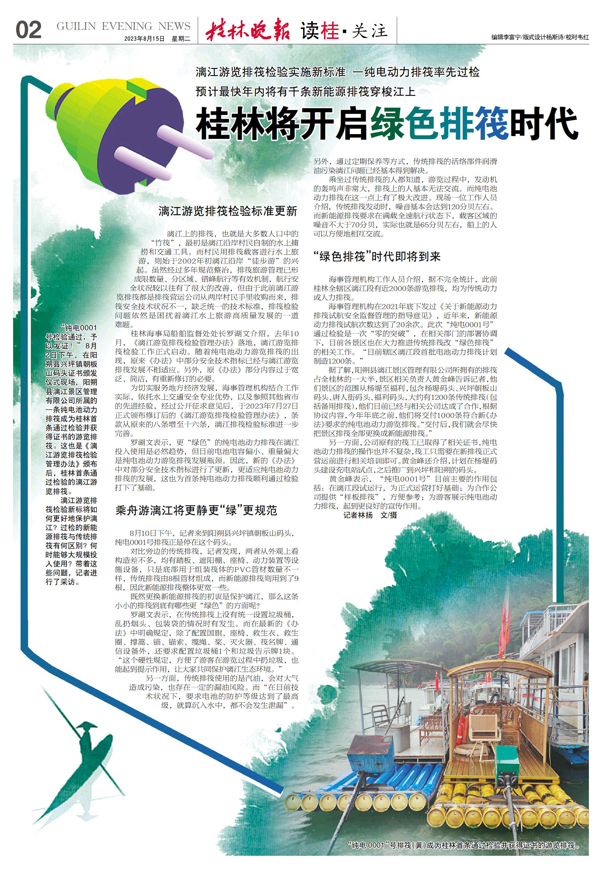 海事管理机构在2021年底下发过《关于新能源动力排筏试航安全监督管理的指导意见》,近年来,新能源动力排筏试航次数达到了20余次。此次“纯电0001号”通过检验是一次“零的突破”,在相关部门的部署协调下,目前各景区也在大力推进传统排筏改“绿色排筏”的相关工作。“目前辖区漓江段首批电池动力排筏计划制造1200条。”