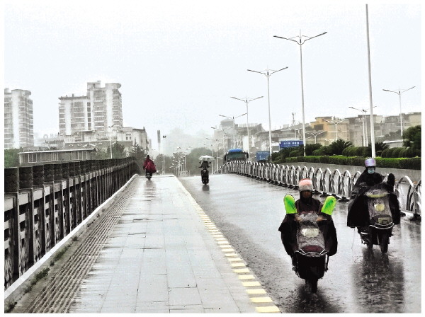 昨天是处暑节气,处暑的到来意味着炎热即将过去,秋风渐起送清凉。当天桂林迎来降雨降温天气,市民们感受到了久违的凉爽。图为市民在雨中经过漓江桥。 记者滕嘉 摄