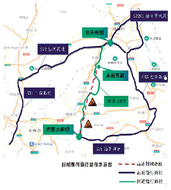 封闭期间,禁止车辆经G72泉南高速公路柳州鹿寨北互通,往黄冕、波寨、永福方向行驶;禁止车辆经G72泉南高速公路黄冕、波寨收费站,往桂林方向行驶。
