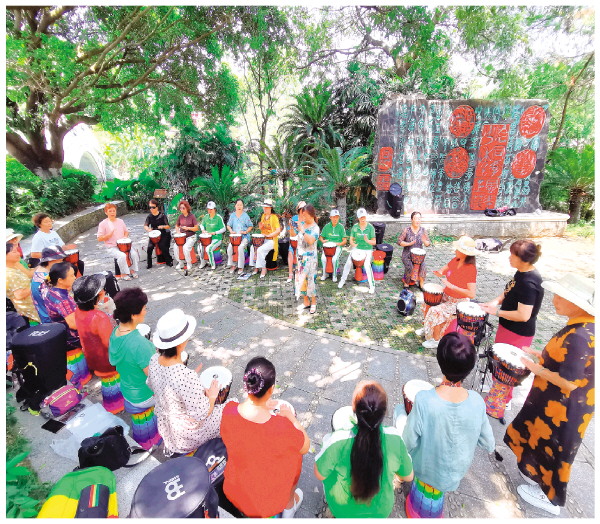 5日上午,一支大妈手鼓队在榕湖边的树荫下演奏起来,拍打出欢快热情的节奏,激发市民对生活的热爱。 记者李凯 摄