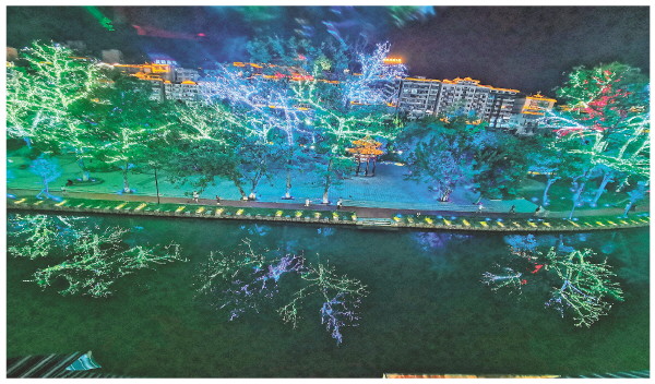 为全面推进文旅振兴,龙胜各族自治县近年来精心设计扮靓县城夜景。图为江心洲灯火辉煌,市民游客来到这里享受夜晚的欢乐时光。 记者滕嘉 摄