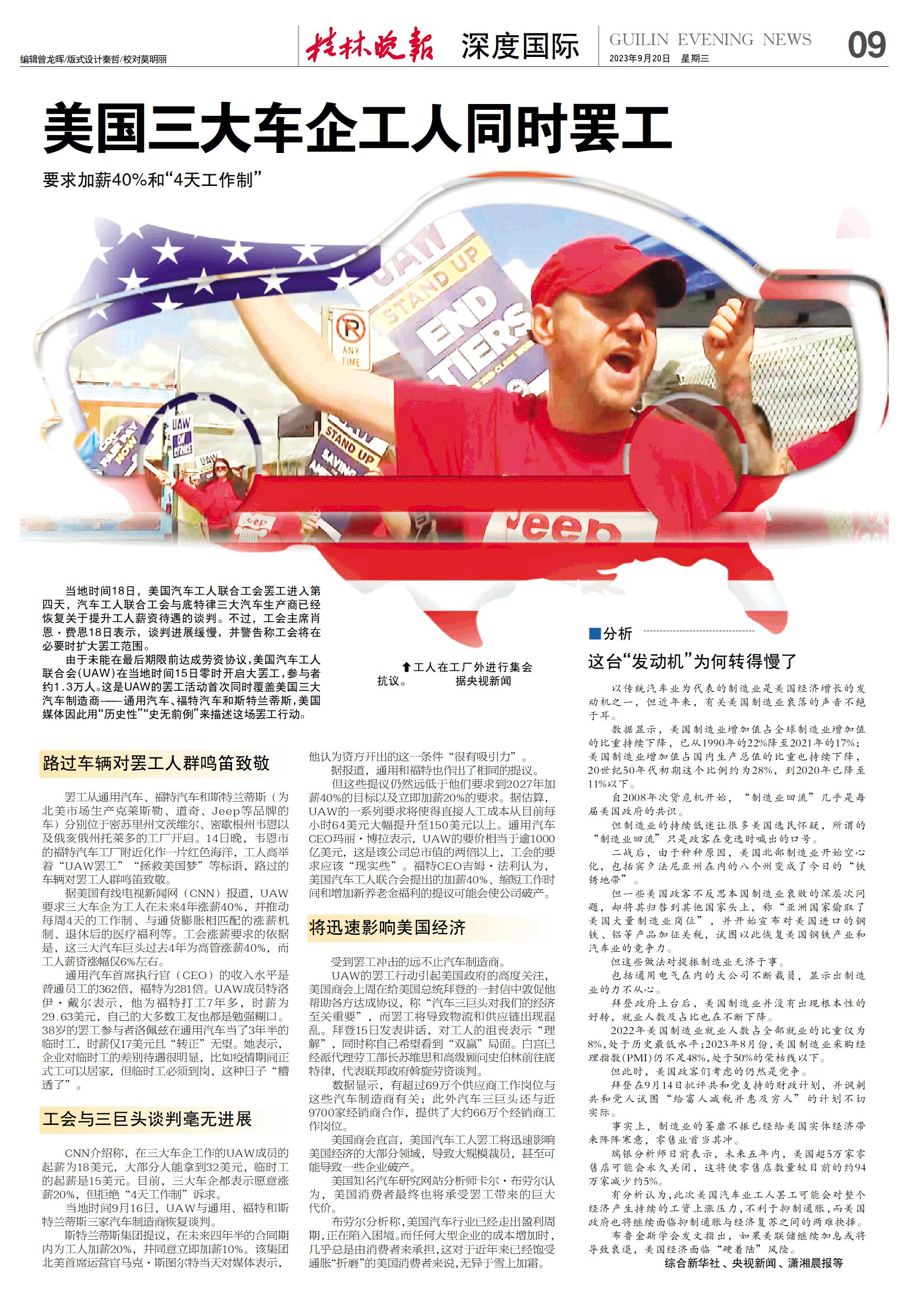 美国三大车企工人同时罢工