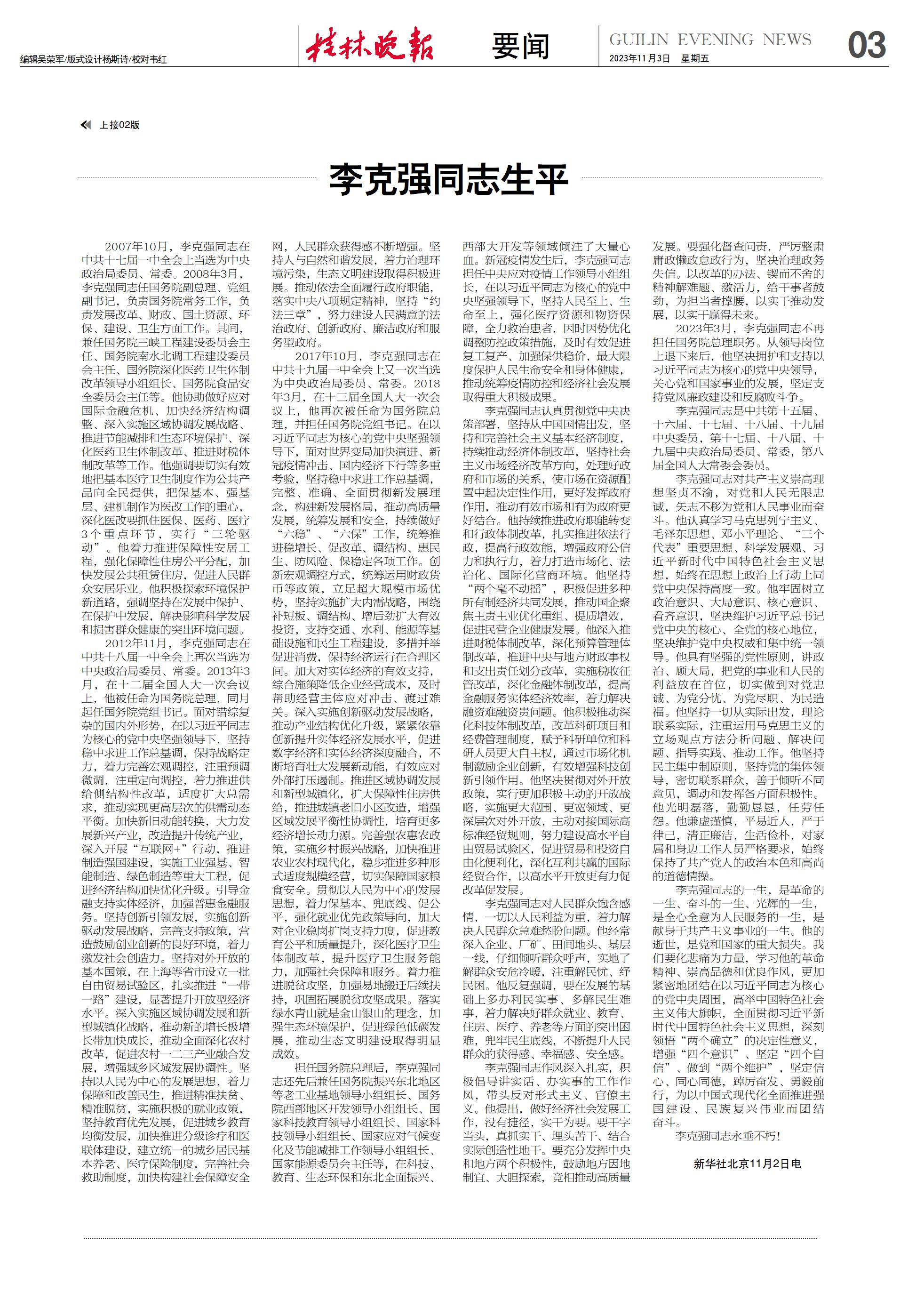 李克强同志的一生,是革命的一生、奋斗的一生、光辉的一生,是全心全意为人民服务的一生,是献身于共产主义事业的一生。他的逝世,是党和国家的重大损失。我们要化悲痛为力量,学习他的革命精神、崇高品德和优良作风,更加紧密地团结在以习近平同志为核心的党中央周围,高举中国特色社会主义伟大旗帜,全面贯彻习近平新时代中国特色社会主义思想,深刻领悟“两个确立”的决定性意义,增强“四个意识”、坚定“四个自信”、做到“两个维护”,坚定信心、同心同德,踔厉奋发、勇毅前行,为以中国式现代化全面推进强国建设、民族复兴伟业而团结奋斗。
