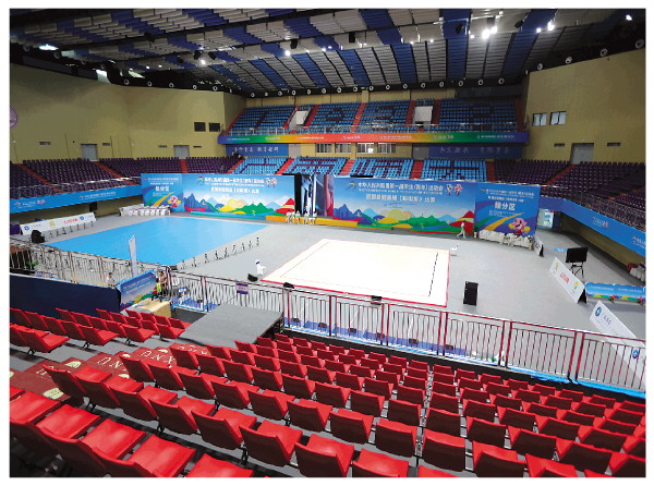 健美操(啦啦操)比赛场地已经准备就绪。记者马翔 摄