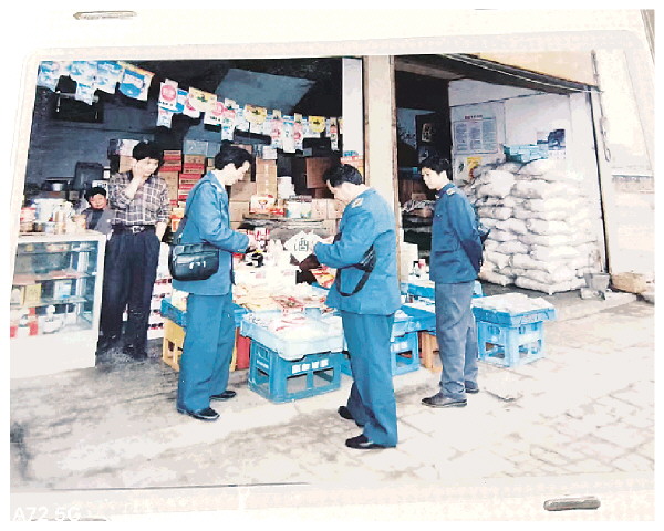 申加林和同事在市场检查假冒伪劣盐产品的资料照片。(申加林供图)