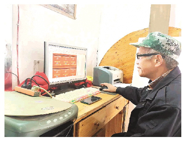 周雪松自己制版画图,制作志愿者“时间银行”手册。 记者苏文娟 摄