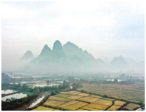 14日,会仙镇,远处的山峰被雾气环绕,若隐若现,和近处的田园形成了一幅美丽的画卷。记者滕嘉 摄