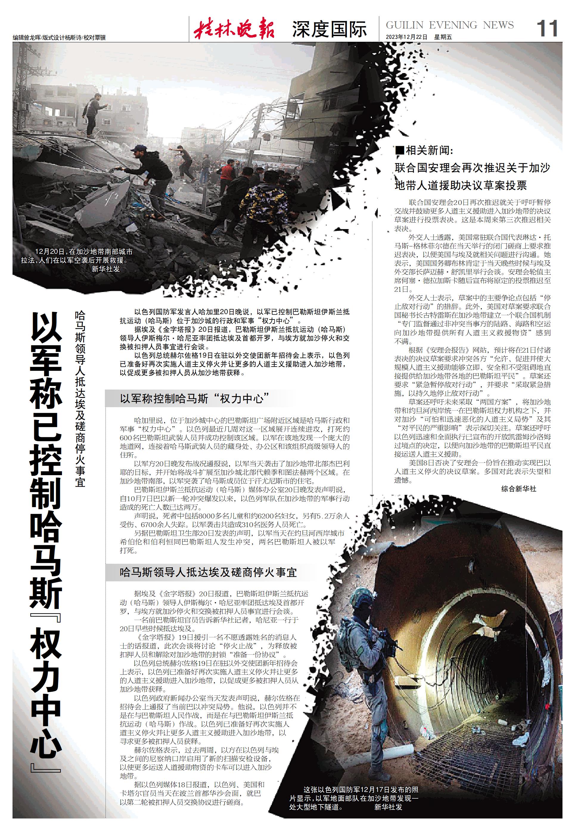 哈加里说,位于加沙城中心的巴勒斯坦广场附近区域是哈马斯行政和军事“权力中心”。以色列最近几周对这一区域展开连续进攻,打死约600名巴勒斯坦武装人员并成功控制该区域。以军在该地发现一个庞大的地道网,连接着哈马斯武装人员的藏身处、办公区和该组织高级领导人的住所。