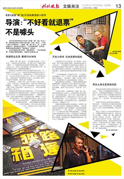 小程序开通后,全国影院给《狭路“箱”逢》排的场次都会在上面显示。记者登录该小程序后发现,页面设置有选座、影片介绍、退款申请等功能。退票申请中提示:观影后的12个小时之内,提交不好看的申请,工作人员会在两个工作日内审核完成并安排退款。比如电影票价40元,退款额是票价的38%,也就是15.2元。