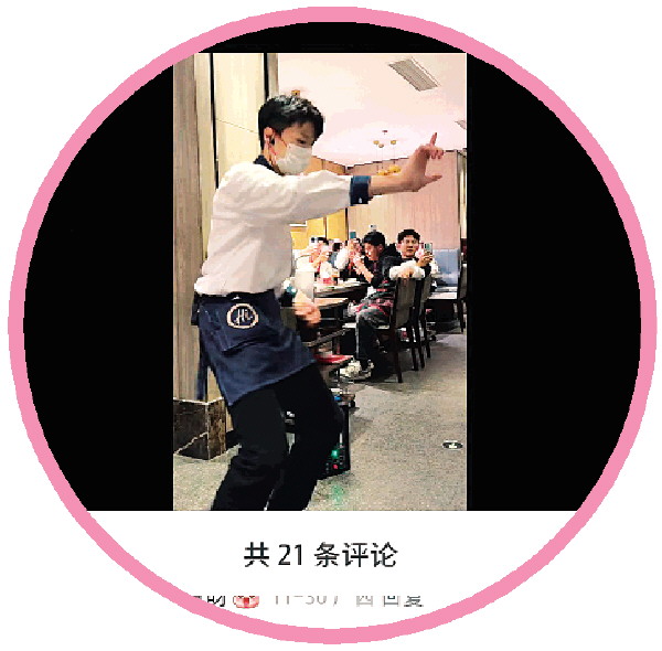 ←18日,欣桂厨(八里街店)店员表演“科目三”。