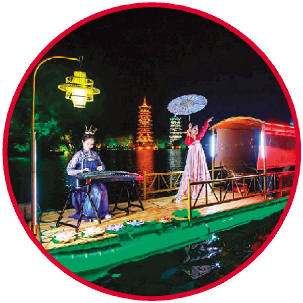 2023年元旦,在两江四湖上演的“半筝落月船”水上表演。(两江四湖景区管理处供图)