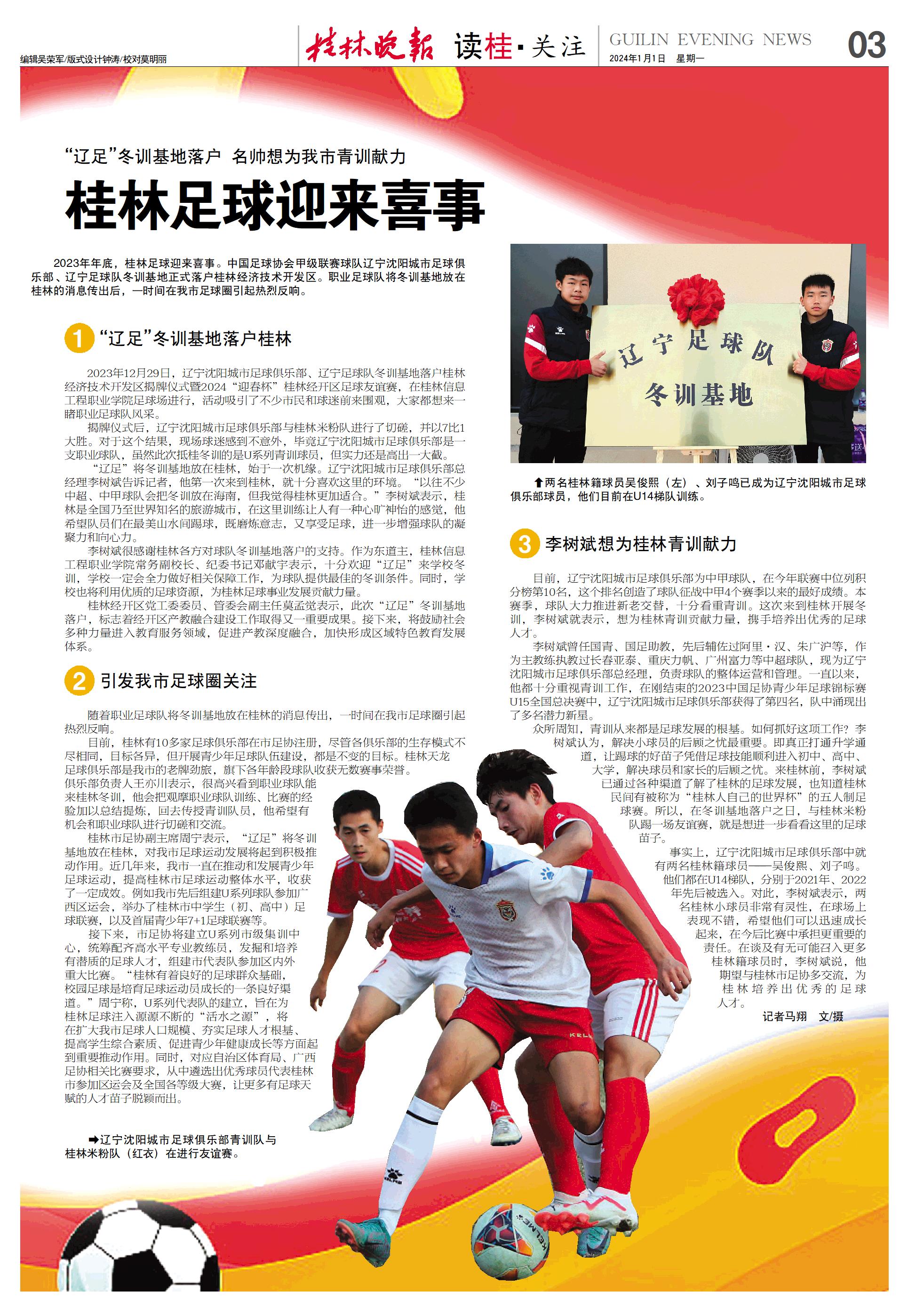 2023年年底,桂林足球迎来喜事。中国足球协会甲级联赛球队辽宁沈阳城市足球俱乐部、辽宁足球队冬训基地正式落户桂林经济技术开发区。职业足球队将冬训基地放在桂林的消息传出后,一时间在我市足球圈引起热烈反响。