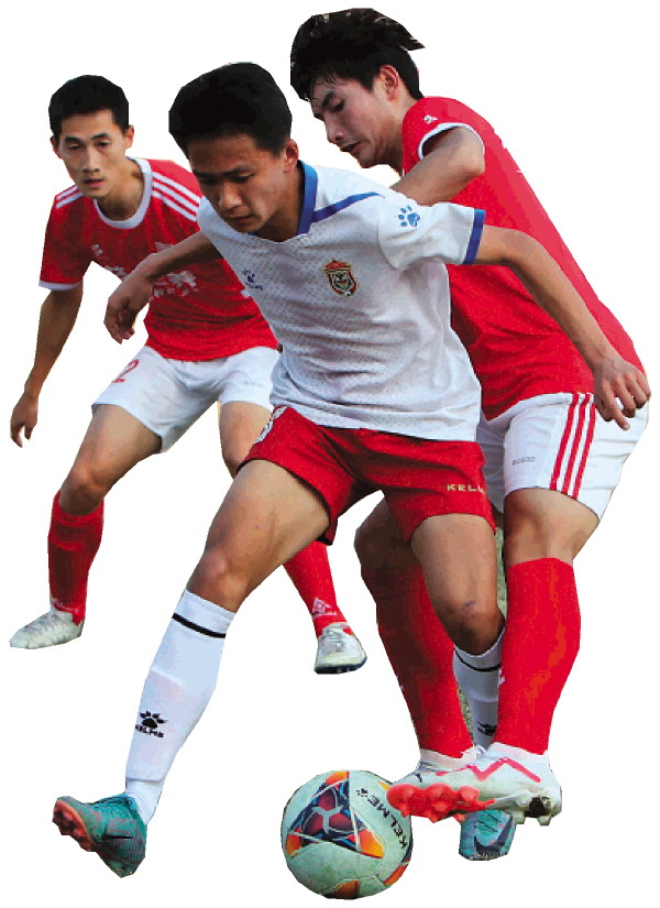 →辽宁沈阳城市足球俱乐部青训队与桂林米粉队(红衣)在进行友谊赛。