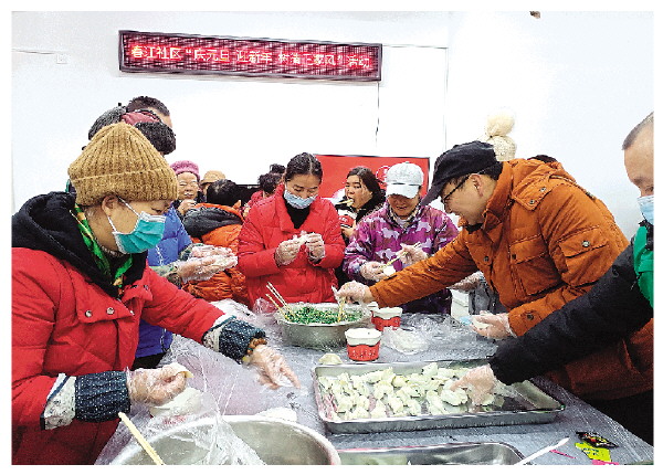 春江社区开展“共度佳节 温暖你我 爱意浓浓”志愿服务活动,志愿者和居民群众一起包饺子、吃饺子、拉家常。(春江社区供图)