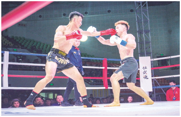 8日晚,武林风中外拳王争霸赛桂林站在市体育馆进行。比赛中,选手们你来我往,寸土不让,奉献了精彩激烈的比赛。记者滕嘉 摄