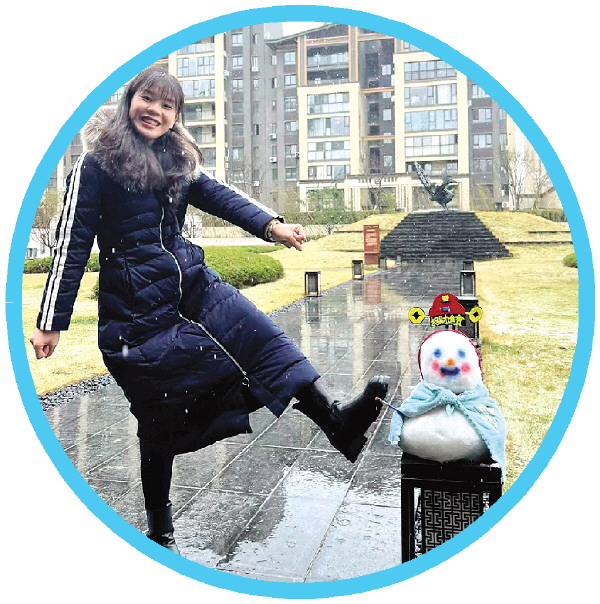 市民与堆好的雪人合影。通讯员容小芳 供图