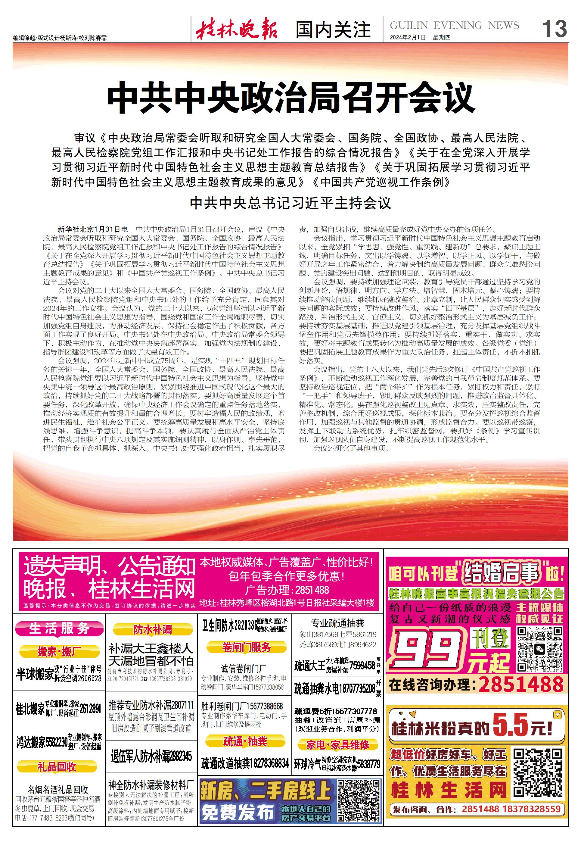 审议《中央政治局常委会听取和研究全国人大常委会、国务院、全国政协、最高人民法院、最高人民检察院党组工作汇报和中央书记处工作报告的综合情况报告》《关于在全党深入开展学习贯彻习近平新时代中国特色社会主义思想主题教育总结报告》《关于巩固拓展学习贯彻习近平新时代中国特色社会主义思想主题教育成果的意见》《中国共产党巡视工作条例》