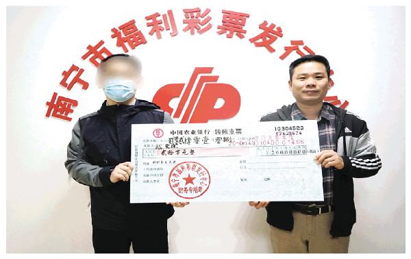 南宁市福彩中心工作人员为稽先生(左)颁奖。