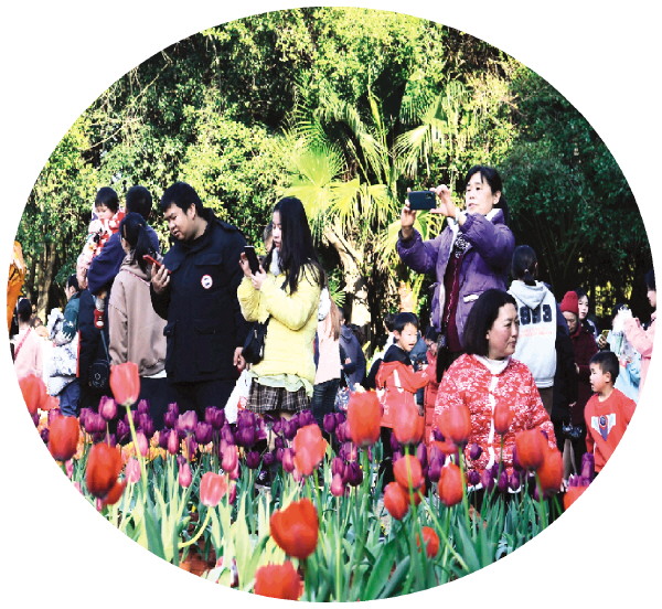 ↑大年初三,市民游客在訾洲公园欣赏郁金香。