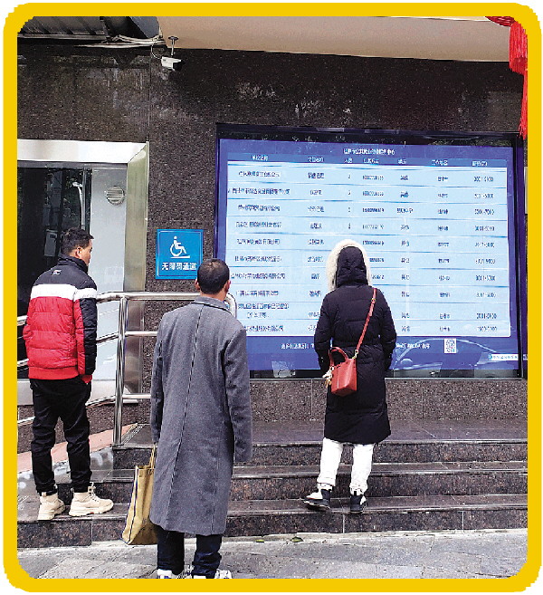 昨日,几位求职者在市公共就业创业服务中心查看企业招工信息。