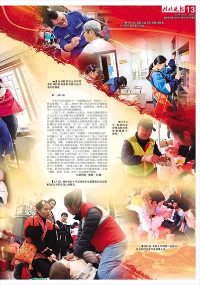 今年3月5日是第61个“学雷锋纪念日”和第4个“广西志愿者日”,近日,桂林开展了形式多样的学雷锋志愿服务活动,义诊、健康咨询、免费理发、维修小家电……以实际行动传承雷锋精神。