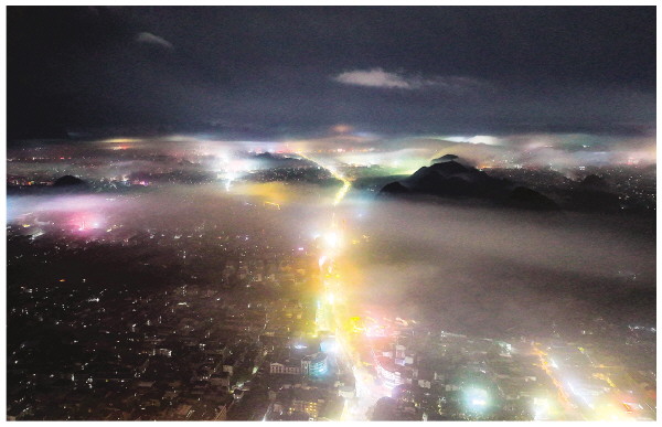 4日晚上,桂林市区被雾气笼罩,灯光和薄雾让城市的夜景更加梦幻。记者滕嘉 摄