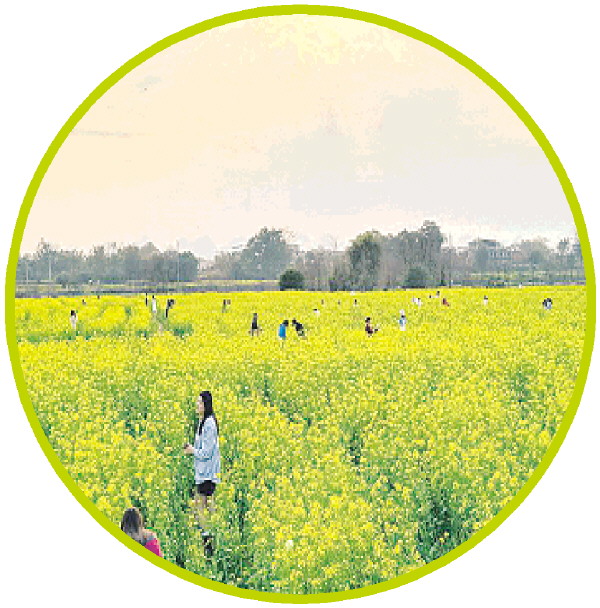日前,记者驱车来到位于雁山区柘木镇的大井头村。刚到村口,便被一大片金黄色油菜花田吸引。众多游人驻足于这片金黄的田野间,用镜头记录下美丽的一刻。
