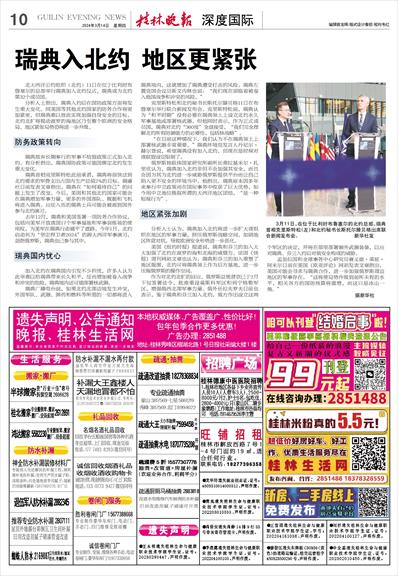 孟加拉国和全球事务中心研究员赛义德·莱延·阿米尔日前在美国《欧亚评论》网站发表文章指出,美国可能会寻求与瑞典合作,进一步加强俄罗斯周边地区的军事存在。“这将使局势升级到前所未有的水平,相关各方的国防预算将激增,而这只是冰山一角。”