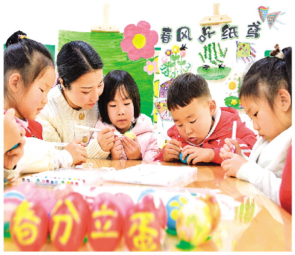3月19日,在湖北省襄阳市保康县一家幼儿园,老师指导小朋友绘制彩蛋。