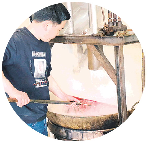 记者步入后厨,榨粉机工作的声音此起彼伏,只见老板将发酵好的米粉熟胚轻放入榨粉机中,细如发丝的米粉便从圆孔中滑落,直接落入滚烫的开水中。老板用一个巨大的漏勺将一锅米粉捞出,迅速淋上冷水,进行降温冷却。老板告诉记者,每一轮出榨米粉的制作大约可以出品15碗,当这一轮的米粉卖得差不多时,才会开始下一轮的制作。“我们全州出榨红油米粉的魅力就在于现吃现做,这样的米粉,不仅口感脆爽,而且少了贮存和运输的环节,更新鲜好吃。”老板告诉记者。