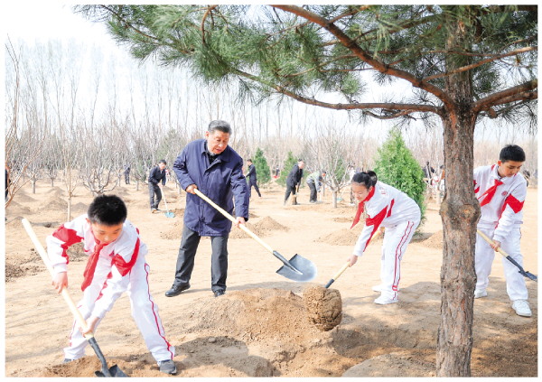 挥锹铲土、培土围堰、提水浇灌……习近平接连种下油松、黄栌、元宝枫、樱桃、红叶碧桃、侧柏等多棵树苗。习近平一边植树,一边询问孩子们的学习生活、劳动锻炼情况。他强调,广大青少年是祖国的未来,从小要积极参加劳动、植树造林,把绿色的种子种进心里,养成尊重自然、热爱自然的意识,勤奋学习、锻炼身体、茁壮成长,德智体美劳全面发展,努力成为国家栋梁。植树现场一派热火朝天的劳动景象,领导同志们同大家一起培土浇水,气氛热烈。