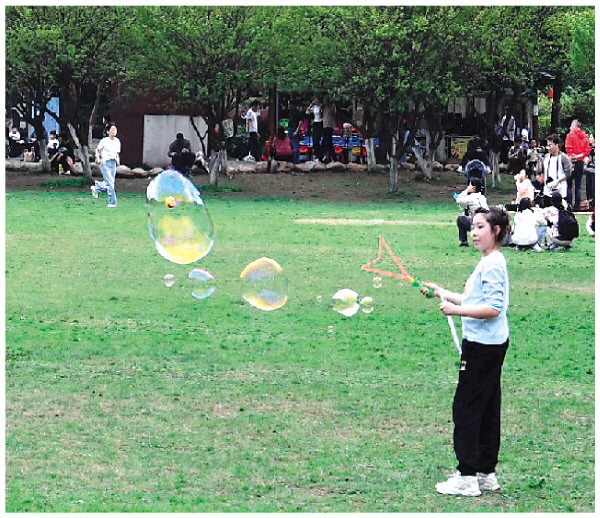 近日,一名小朋友在七星公园的草坪上玩泡泡玩具,不远处有几位市民在玩排球,因为视觉角度错位,排球像是被气泡包裹住,形成了有趣的气泡“球”。