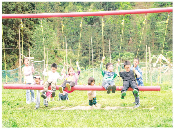 近日,在龙胜各族自治县乐江镇江口村,几个小朋友正在一个多人秋千上一起玩耍,享受开心的童年时光。 记者滕嘉 摄