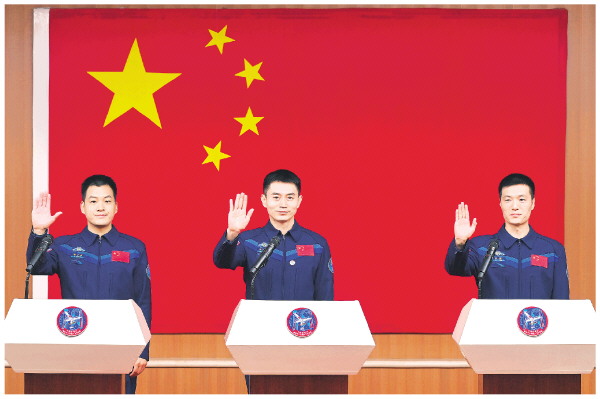 24日,神舟十八号载人飞行任务航天员叶光富(中)、李聪(右)、李广苏在酒泉卫星发射中心问天阁与中外媒体记者集体见面。