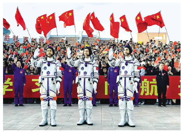 25日下午,神舟十八号载人飞行任务航天员乘组出征仪式在酒泉卫星发射中心问天阁圆梦园广场举行。这是三名航天员在出征仪式上。新华社发