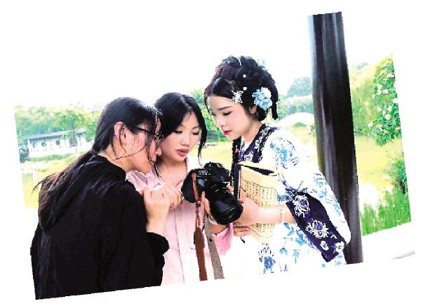 姜策兰(中)给小胡(右)看刚刚拍摄的照片。