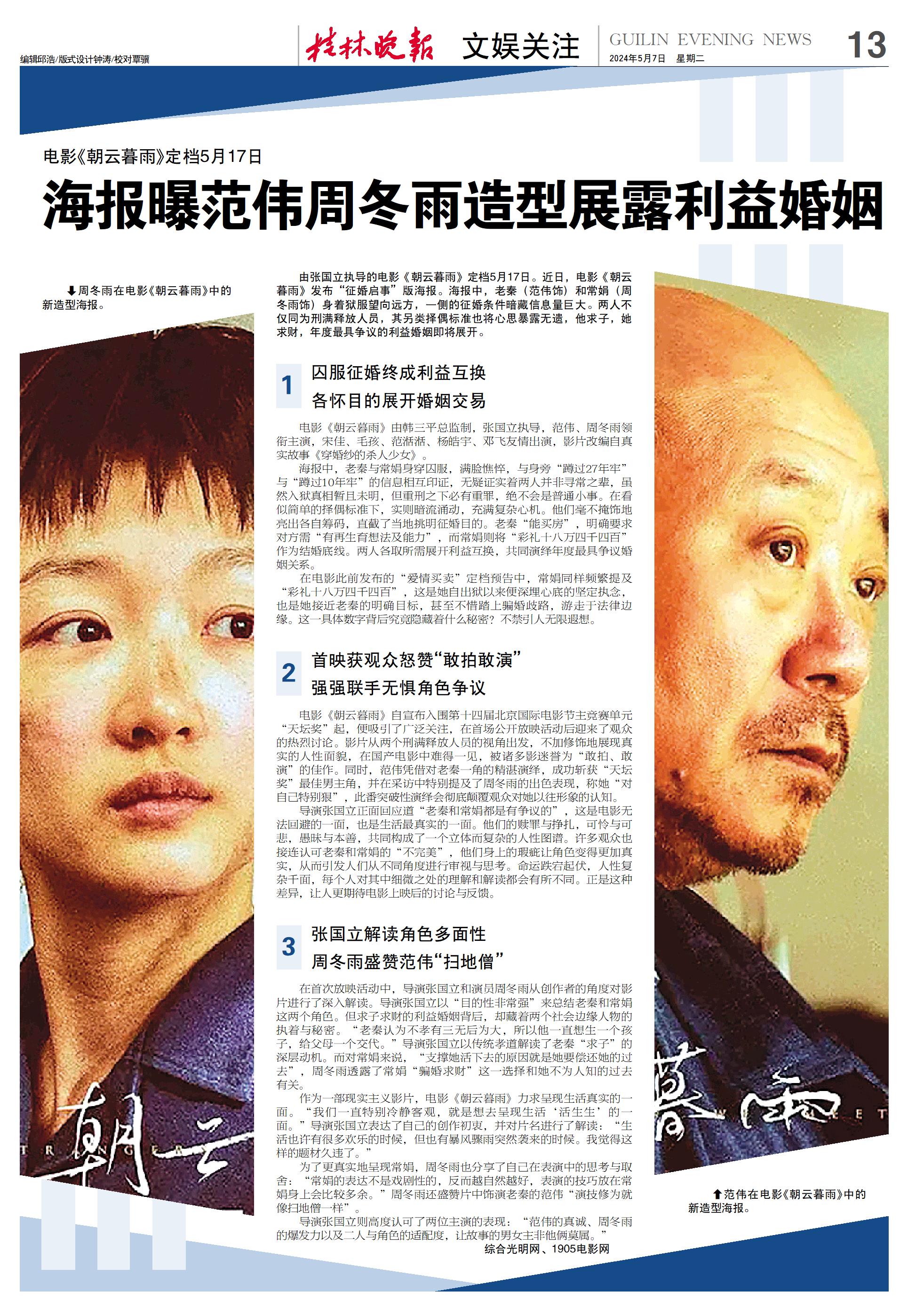 由张国立执导的电影《朝云暮雨》定档5月17日。近日,电影《朝云暮雨》发布“征婚启事”版海报。海报中,老秦(范伟饰)和常娟(周冬雨饰)身着狱服望向远方,一侧的征婚条件暗藏信息量巨大。两人不仅同为刑满释放人员,其另类择偶标准也将心思暴露无遗,他求子,她求财,年度最具争议的利益婚姻即将展开。