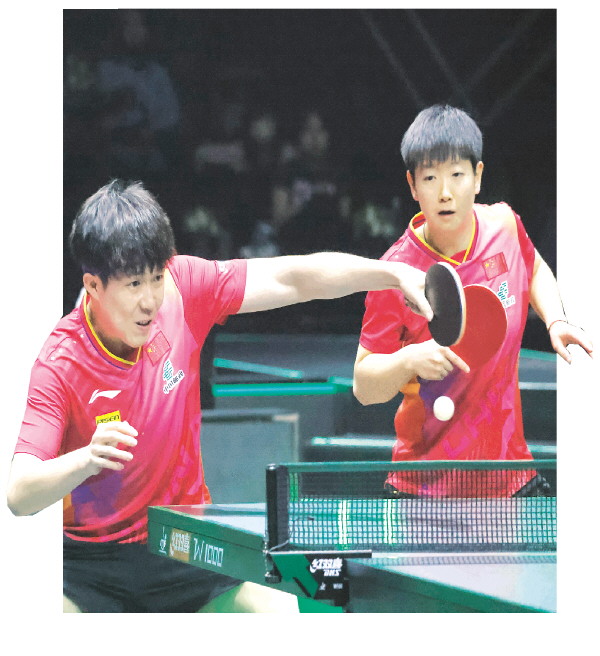 王楚钦(左)/孙颖莎在比赛中。 新华社发